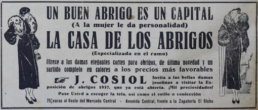 | dc.description | Anuncio de un local donde vende abrigos para mujer. En cada extremo del anuncio se presentan a dos mujeres con sombrero y tacones, vestidas elegantes. | |