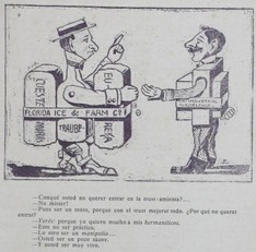| dc.description | Aparecen dos hombres que parecen representar dos distintas empresas, uno de ellos tres grandes bloques unidos con una barra que dice "Florida Ice & Farm C", este lleva un sombrero y corbatín, mientras el otro solo tiene un bloque que dice "CIA. Industrial Alajuelense" tiene mostacho y cabello bien peinado. | |
