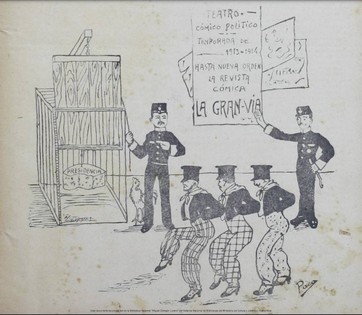 | dc.description | Hay cinco hombres, uno de ellos sosteniendo la puerta de una jaula, dentro hay un objeto que representa la presidencia, otro guía a los restantes a esta jaula, visten uniforme de policía, los otros tres van en fila bailando sincronizados. | |