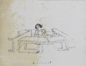 | dc.description | Se puede ver a una niña de cabello corto y oscuro, vestido de color claro con vuelos en las mangas, zapatos de muñeca y una expresión de miedo. Se encuentra rodeada de mesas de madera. | |