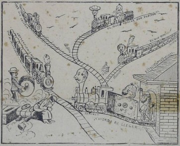 | dc.description | Hay una terminal de trenes, y cinco trenes distintos, cada uno representa a un candidato a presidencia, hay un tren extra que está fuera de la vía volcado y un hombre sentado sobre este llorando. | |