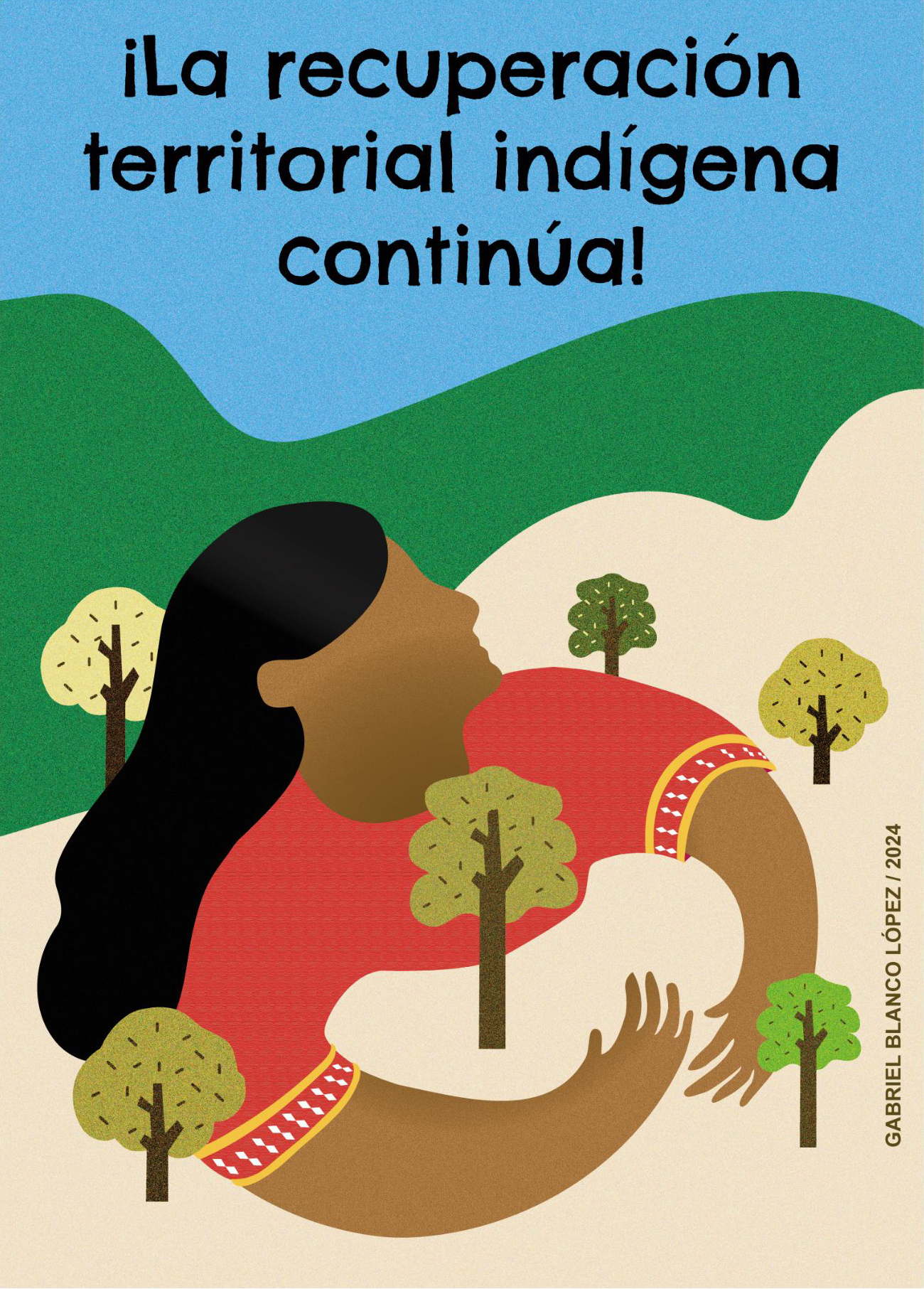 | dc.description | El cartel aborda el tema de la recuperación territorial indígena, una lucha que inició hace más de 500 años, cuando fueron trasladados o despojados de sus tierras ancestrales. Desea transmitir la sensación de recuperar lo propio, esto se conecta con la figura de una mujer indígena que abraza un árbol, rodeando con sus brazos todo un territorio. La recuperación de los territorios pertenecientes a los pueblos originarios es representada con el personaje vestido con el vestuario que utilizan las mujeres indígenas de la cultura Ngäbe-Buglé. La postura de la mujer aporta equilibrio asociado a la técnica visual de la pasividad, simbolizando la seguridad de la recuperación territorial. El vínculo de los pueblos originarios con la tierra es clave en la cosmovisión de las culturas indígenas y vital para el reconocimiento y respeto de los derechos de las comunidades. Así se establece en el Convenio 169 de la OIT sobre pueblos indígenas y tribales (1989), en la Declaración Americana sobre Derechos de los Pueblos Indígenas (OEA 2016) y en la Ley Indígena de Costa Rica de 1977, que busca revertir la histórica usurpación de tierras y garantizar la devolución de territorios a sus legítimos dueños, un tema en disputa aún en la actualidad, pues depende de la voluntad política para desalojos e indemnizaciones, lo que genera incertidumbre sobre su continuidad. Nota: La representación del color en el cartel es según la concibe el diseñador del cartel, no los pueblos indígenas. | |