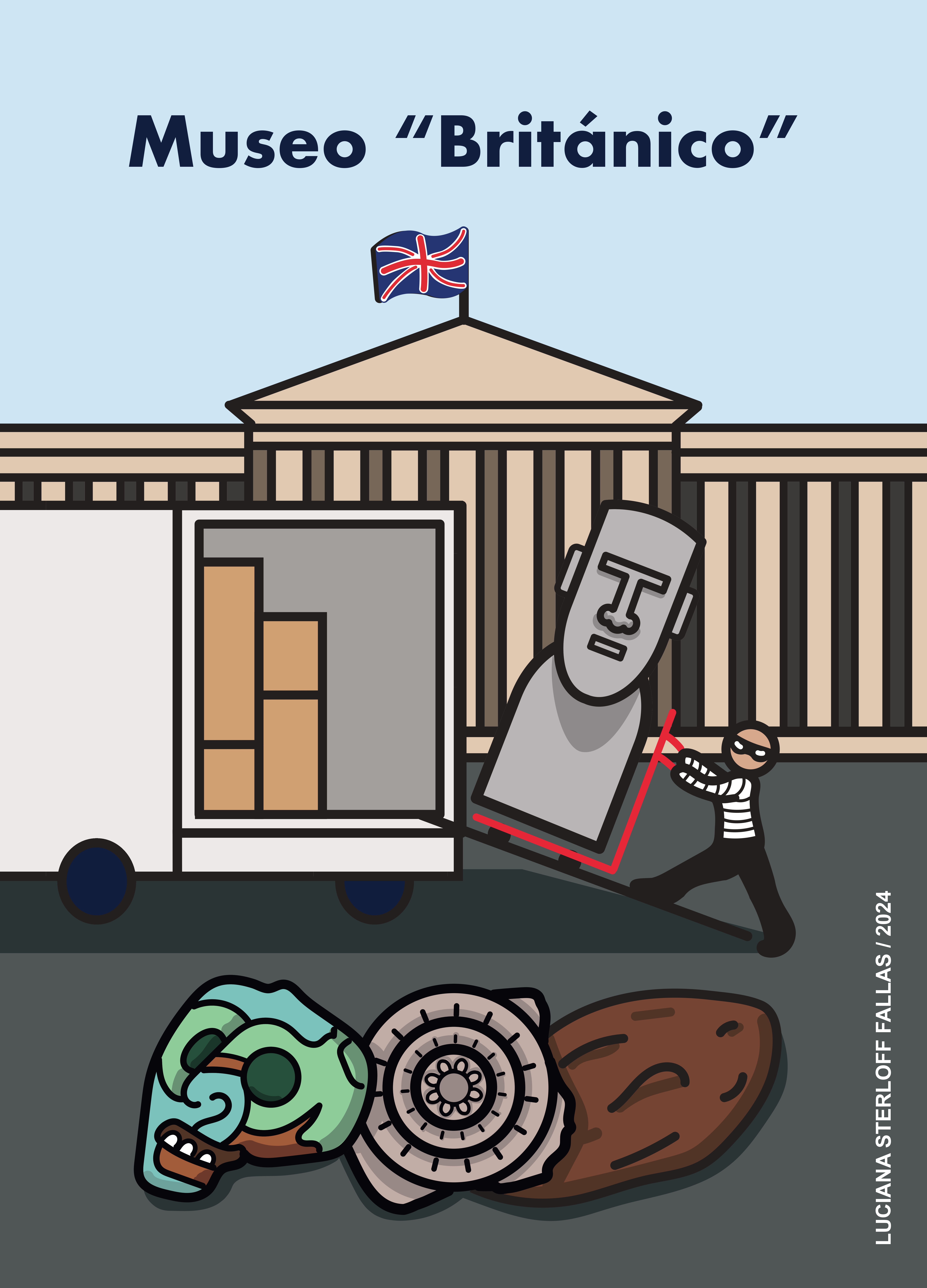 | dc.description | El cartel presenta de manera irónica la controversia del Museo Británico: su colección de arte está constituida por obras de poblaciones originarias de diferentes partes del mundo, obtenidas mediante el extractivismo a través del poder colonial ejercido por el Imperio británico y otros métodos moralmente cuestionables. Este museo alberga más de ocho millones de objetos de pueblos originarios y ha sido considerado uno de los más importantes a nivel mundial en arqueología y etnografía. Por ello, los gobiernos de países como Chile, Nigeria, India, México y Australia han reclamado la devolución de artefactos de gran importancia cultural e histórica para sus pueblos indígenas y originarios; sin embargo, el Museo Británico se ha negado a entregar las piezas. El cartel presenta distintos artefactos representativos de estas culturas. | |