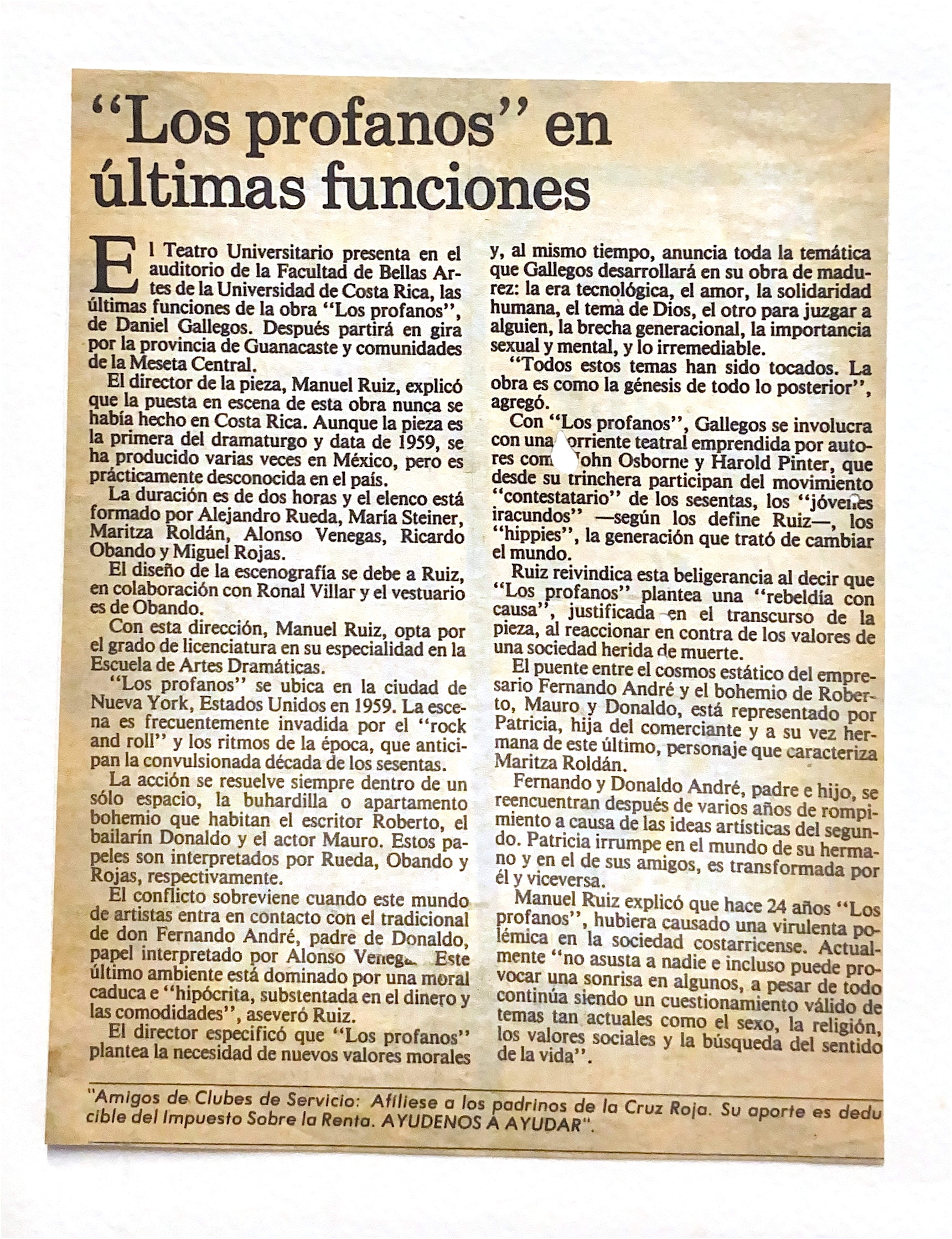 | dc.description | Nota de periódico en la que se anuncian las últimas funciones de la obra "Los profanos". | |