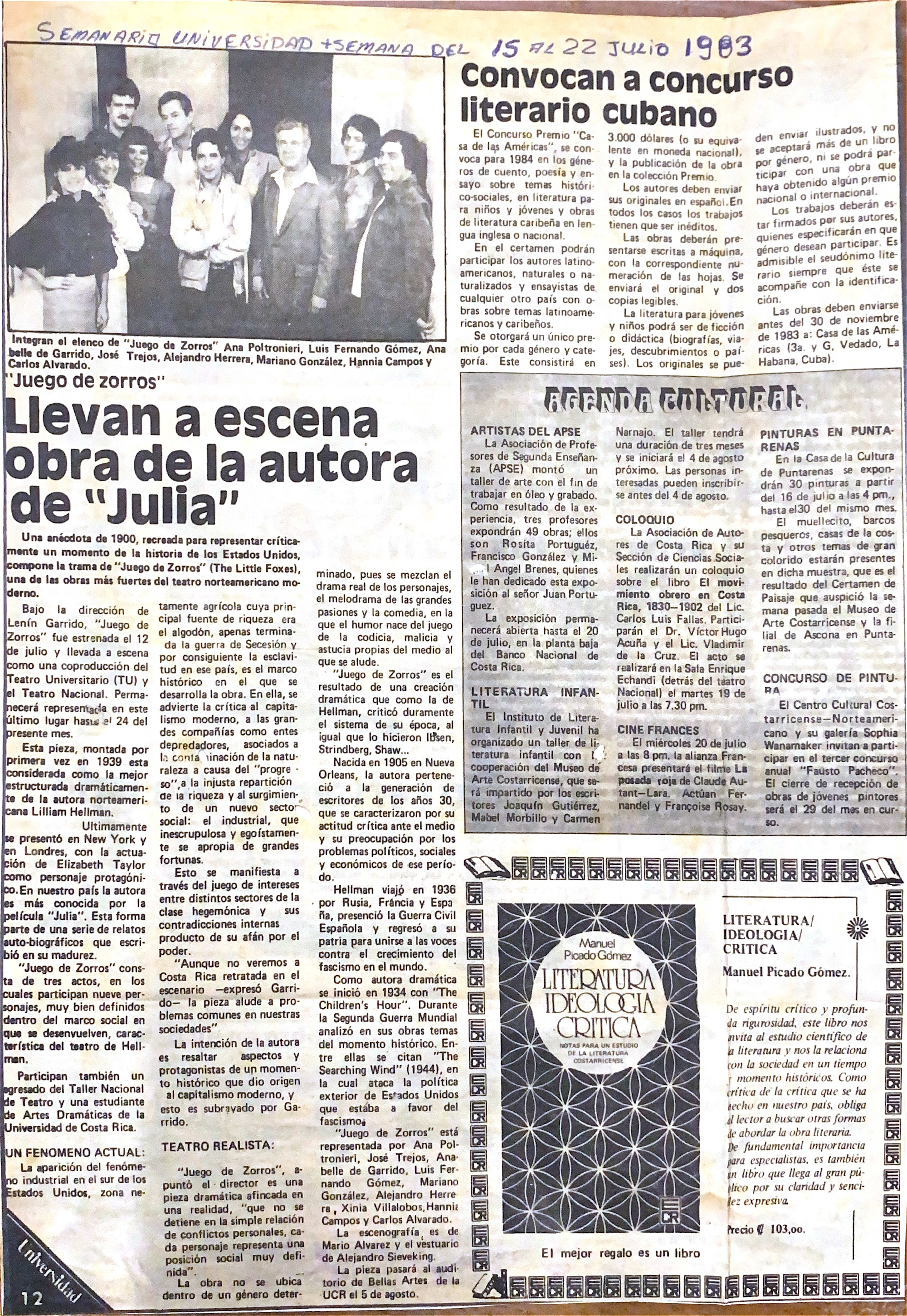 | dc.description | Nota publicada en el periódico Semanario Universidad en la que se habla de la obra "Juegos de zorros" y otro tipo de actividades culturales (pintura, literatura, entre otros). | |