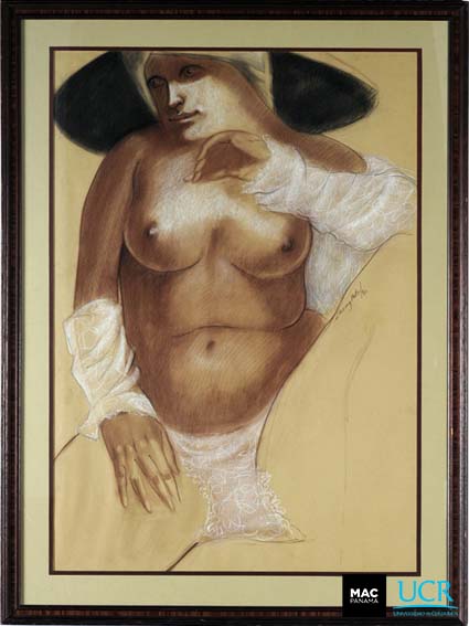 | dc.description | Figura femenina en posición sedente, con sombrero negro, torso desnudo, los antebrazos y la parte inferior del cuerpo los cubre una tela blanca de encajes. La pierna izquierda doblada, y el brazo izquierdo apoyado sobre la rodilla del mismo lado. | es |