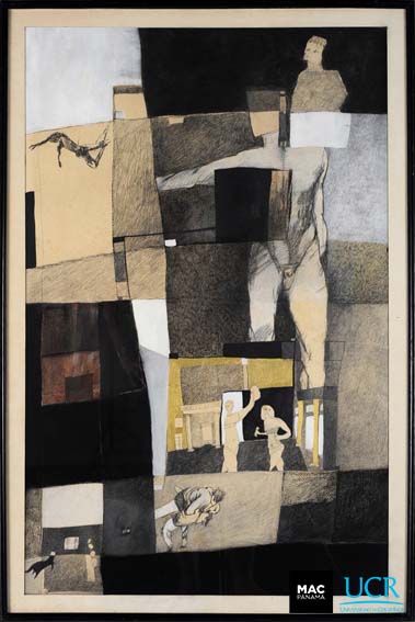 | dc.description | Obra de formato vertical dividido en rectángulos ocres, blancos y negros. Figuras humanas en diversas posiciones, entre las que destaca un desnudo masculino de mayor tamaño. | es |